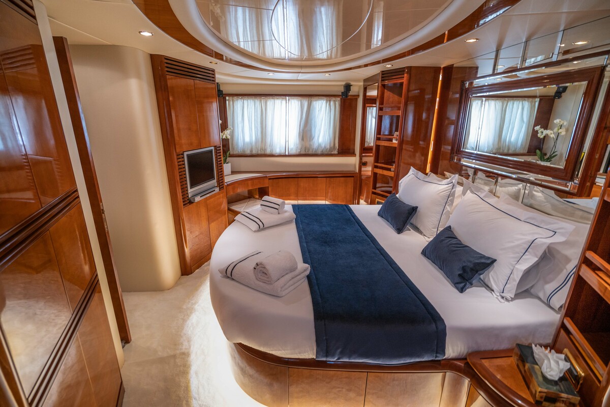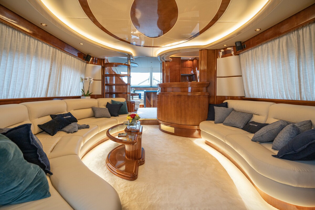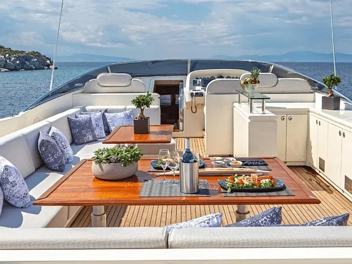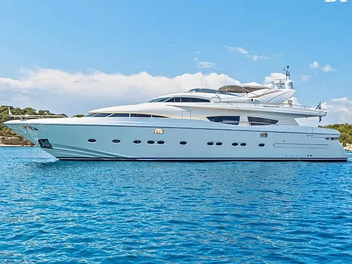 Discover luxury aboard the meticulously refitted Ferretti 880, a 27.03m flybridge yacht chosen for an exclusive experience. Indulge in the Jacuzzi on the sundeck, a beach club swimming platform, and more. With 4 cabins for 9 guests and a dedicated crew of 5, this yacht ensures opulence and personalised service.