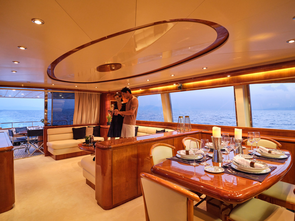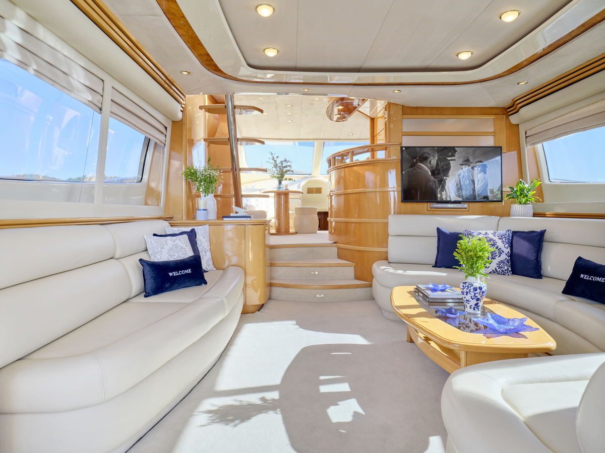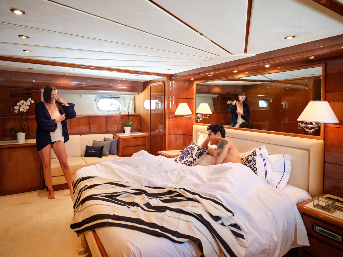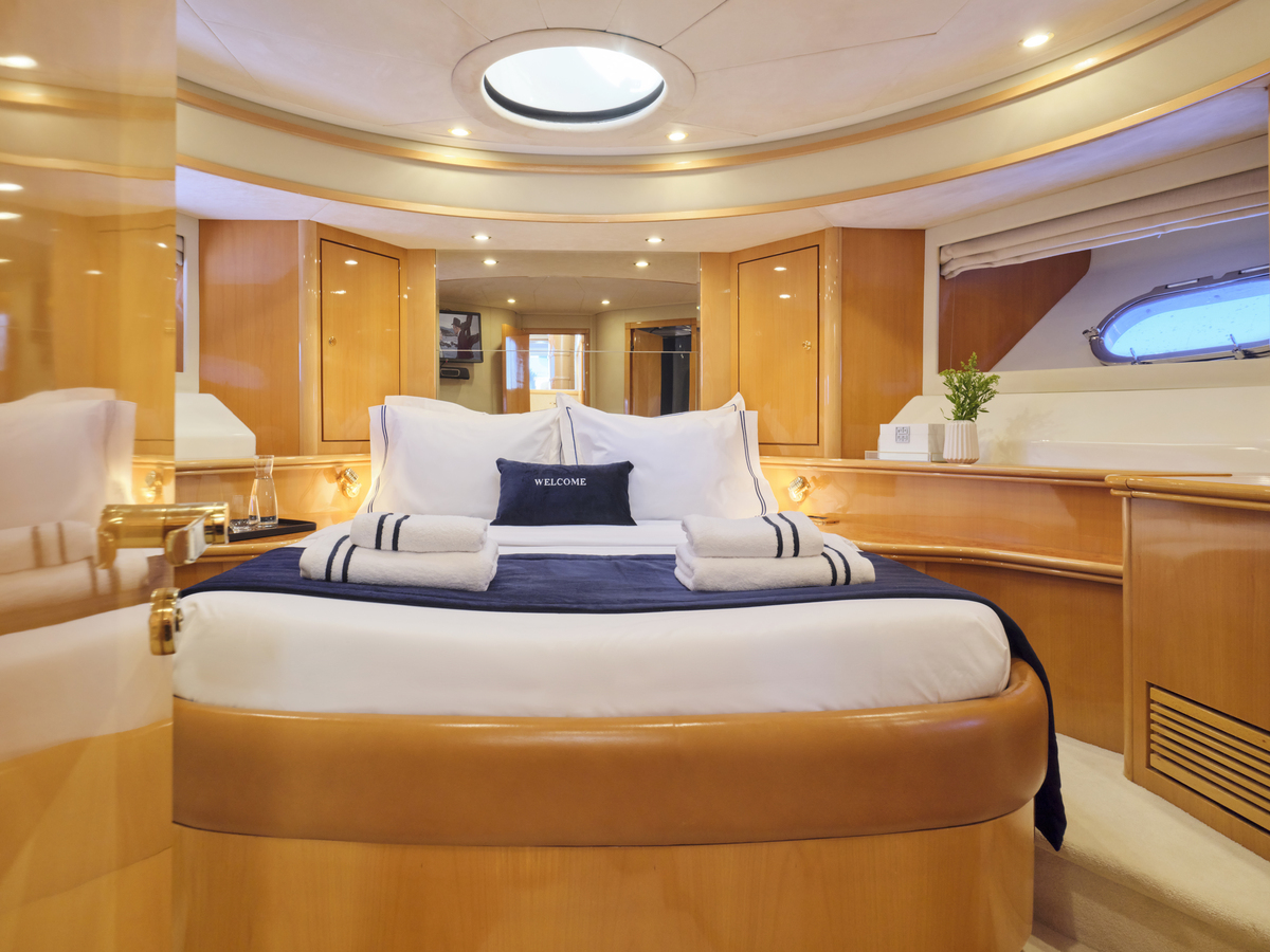 Accommodating 6 guests in 3 cabins, complemented by a skilled crew of 2+1, the Princess V70 offers flexible living spaces and a retractable sliding sunroof. Enjoy al fresco dining with a BBQ on the aft deck and access a great selection of water toys for added excitement.